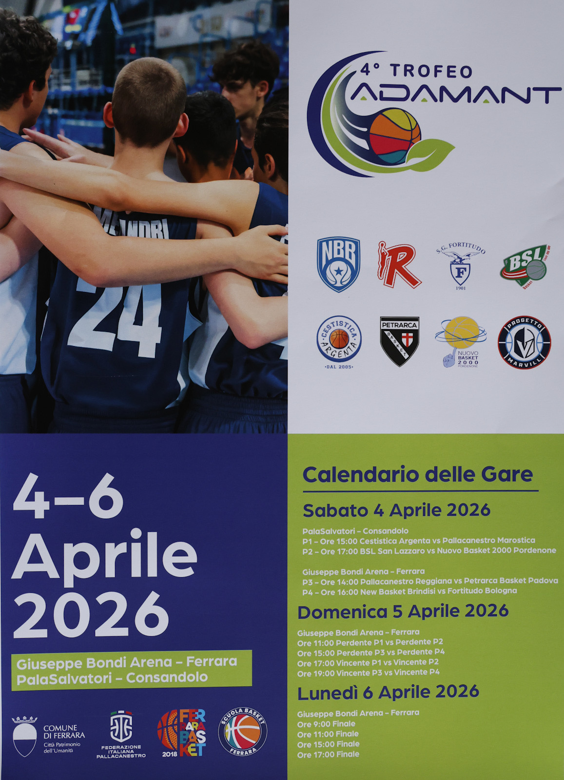 Tutto pronto per la palla a due del 4° Trofeo Adamant, un appuntamento ormai fisso nel panorama del basket giovanile nazionale. Per tre giorni, dal 4 al 6 aprile 2026, Ferrara e Consandolo diventeranno capitali della categoria Under 15 Eccellenza, ospitando otto tra le società più prestigiose d’Italia per un torneo di altissimo livello tecnico e agonistico.